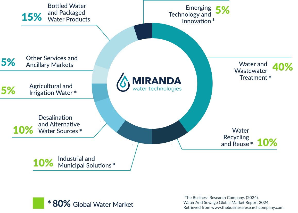 Miranda Water Technologies addresses 80% of the global water market’s major segments, delivering innovative and scalable solutions to tackle the most urgent water challenges. Through advanced technologies and an unwavering commitment to sustainability, Miranda empowers industries and municipalities and strengthens communities by ensuring reliable and affordable access to clean water for all.